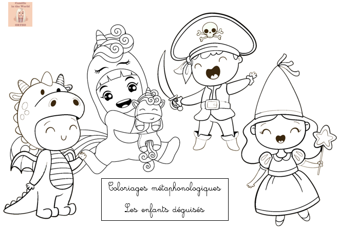 Ce pdf comporte 4 coloriages métaphonologiques d'enfants déguisés en licorne, dragon, pirate et fée. Les consignes sont écrites et peuvent être lues ou données à l'oral, par exemple "colorie le chapeau de la fée avec une couleur qui se termine par le son [Z]" (rose).