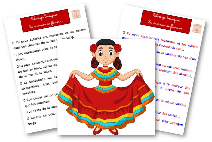 Coloriage Consignes La danseuse de Flamenco - Lecture et compréhension de phrases