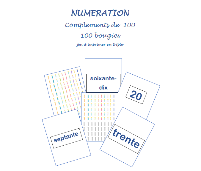 Ce jeu fait travailler la numération en base 10, les dizaines et les compléments de 100. Il comporte les formes littérales du nombre (écrites), arabes (avec les chiffres) et en représentations symboliques (des bougies dessinées). Ce jeu peut se jouer - en bataille - en mémory - en mistigri - en devinette (c'est plus, c'est moins : pour la sériation...) - ou tout simplement en appariement des compléments de 100 (chronométré ou non). Le jeu est adapté au code littéral Français, Belge et Suisse.